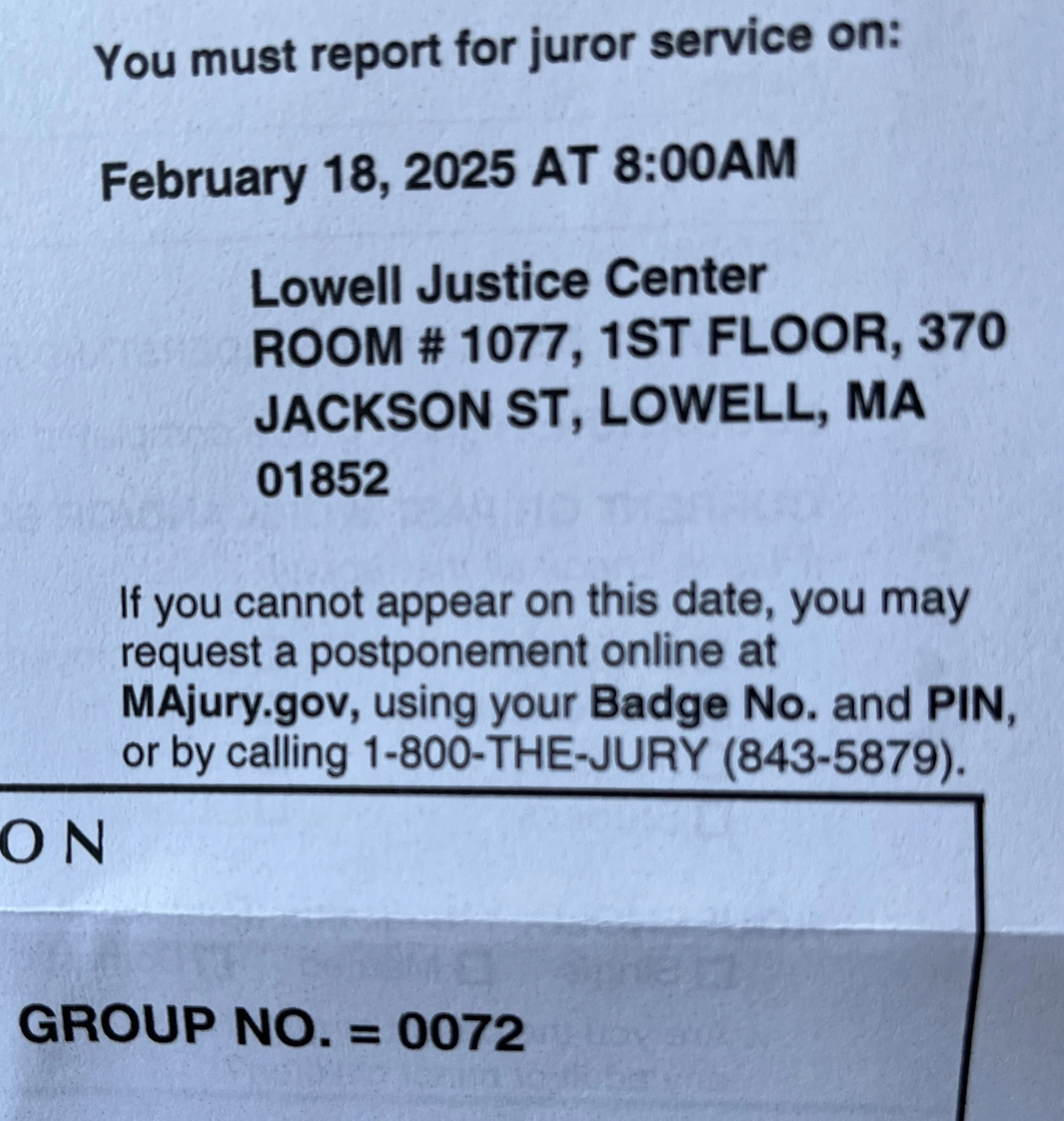 So, real quick, here’s the way this happens in Massachusetts: you get a summons for jury duty, when you respond you get a group number, and then after 3pm on the business day before your jury duty date, you call the number to see if your group has to report.