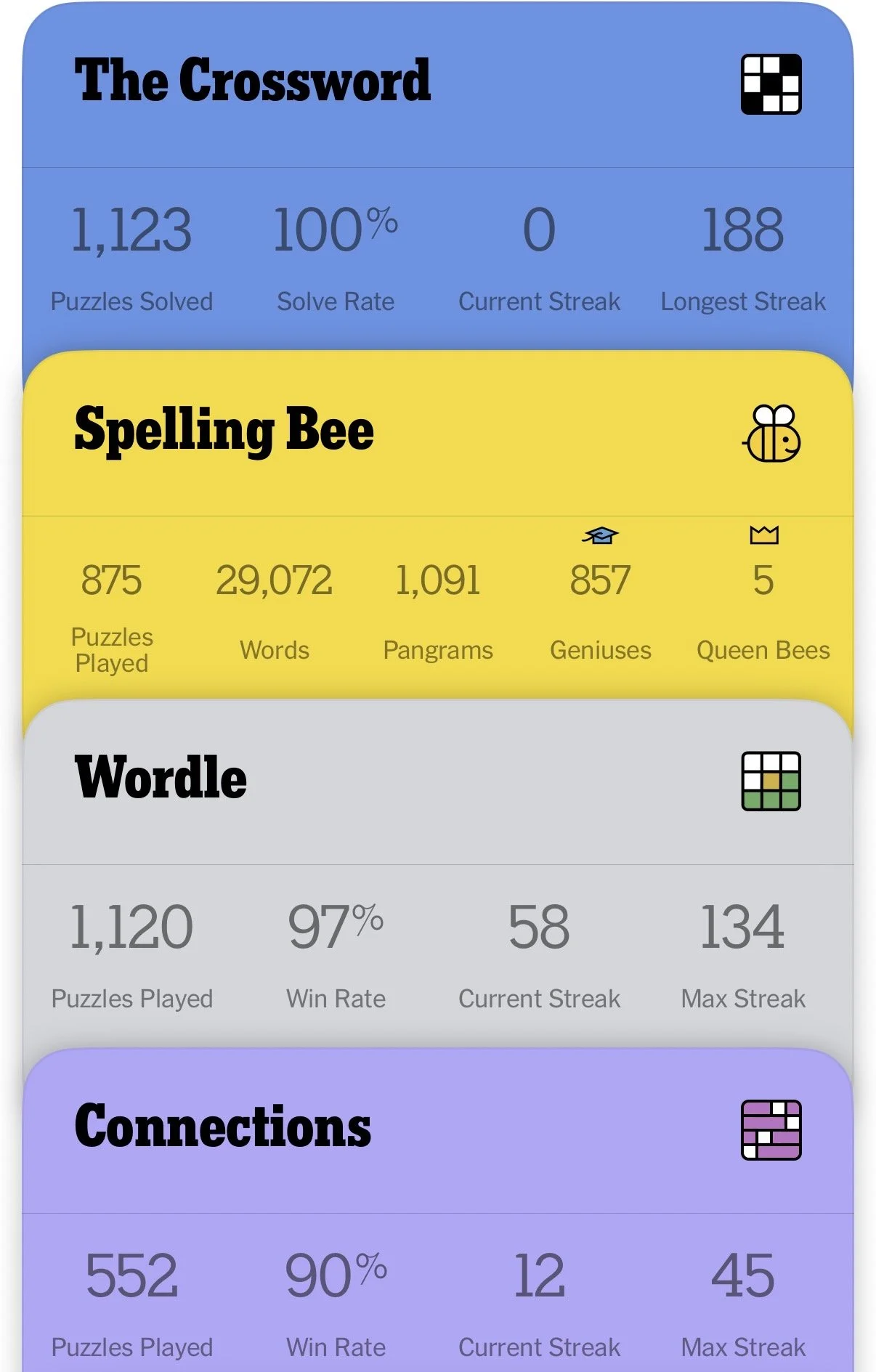 We’ve mentioned the New York Times games I like to play here enough that I think it’s fitting that for one of these final few posts of the year I share some of the stats the app shared with me recently.