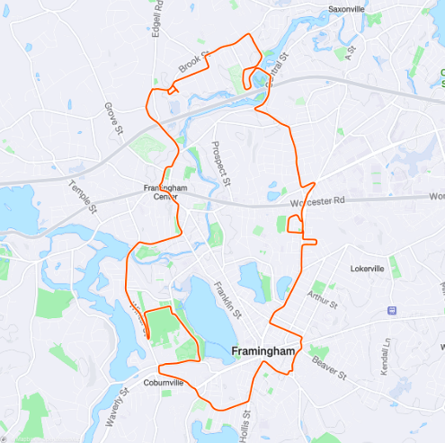 I always forget that you get to downtown Framingham after just 3.5 miles, though, so I added some zigs and zags on the way down and then did the same coming back and I was pretty impressed with the 14-mile loop I ended up creating, all within Framingham, that you see pictured there at the right.