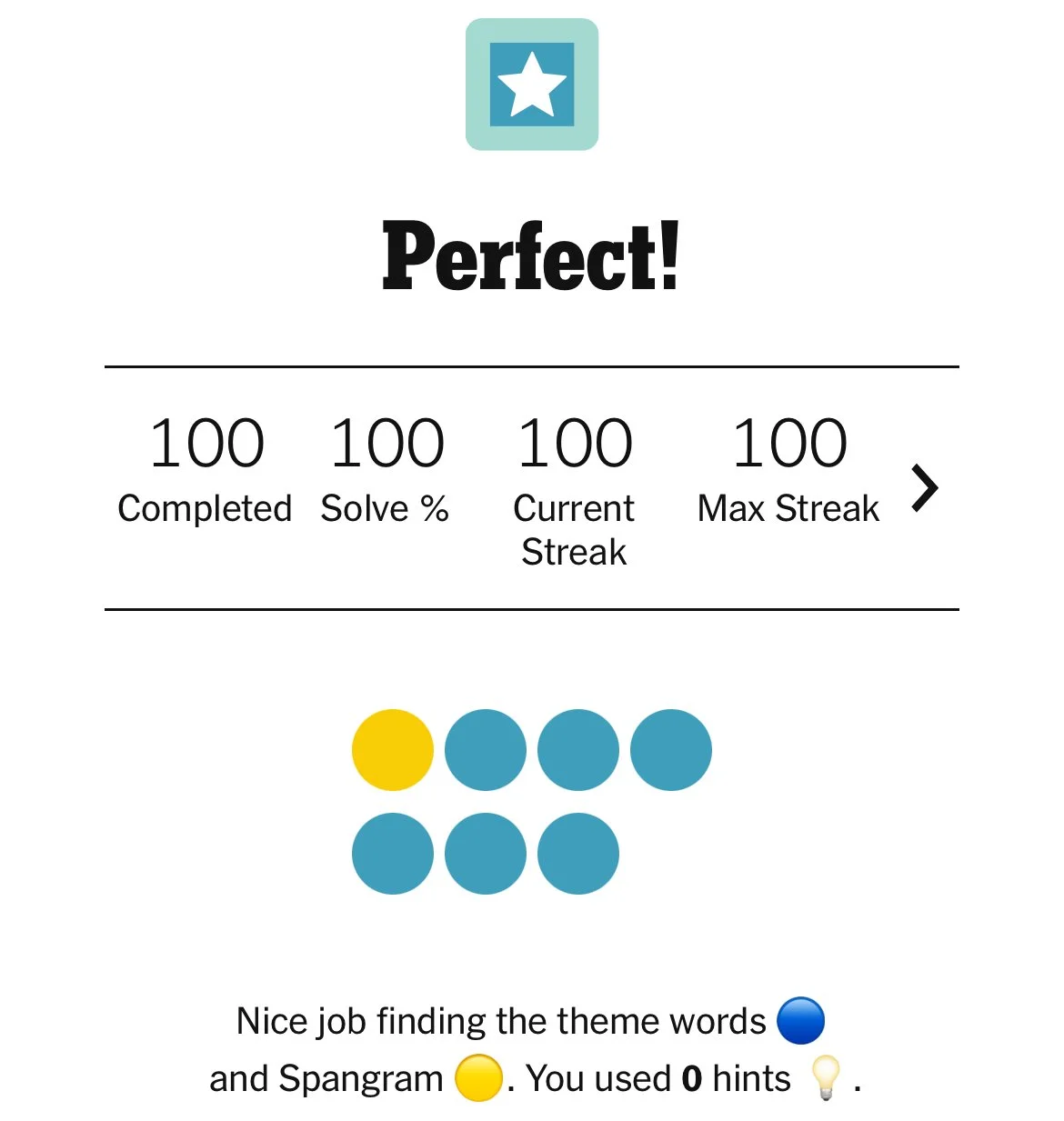 This doesn’t have much to do with anything but I liked the 100s across the board on my 100th day of playing Strands.