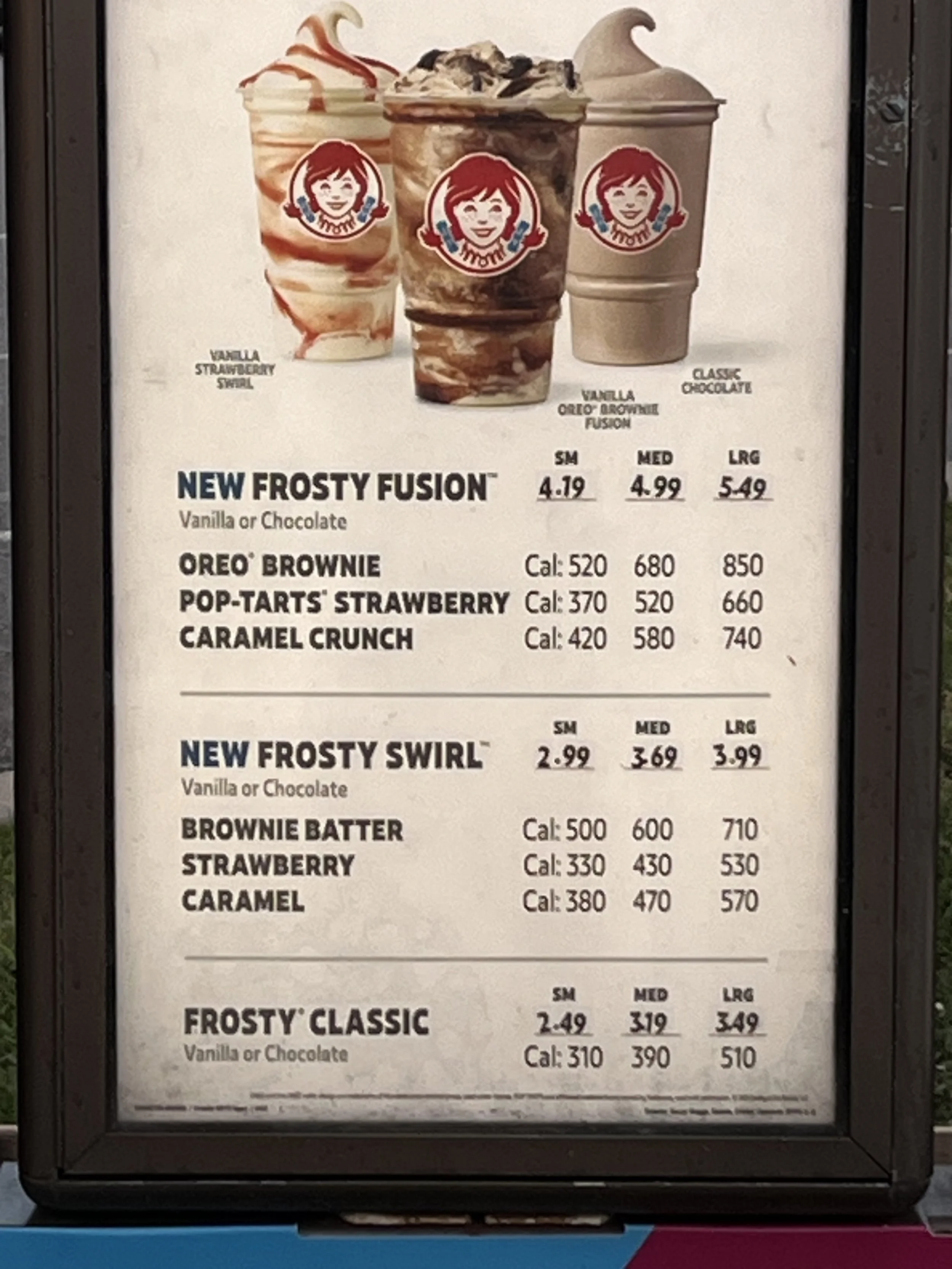 We decided on Wendy’s, and we had a couple of chocolate Frostys and a couple of vanilla Frostys.